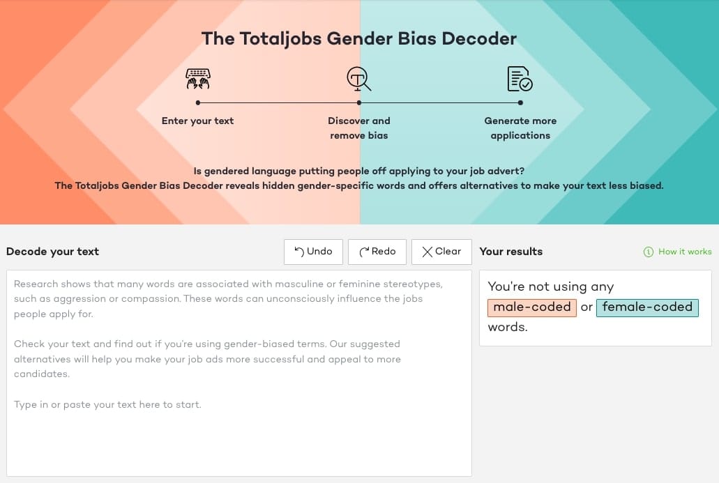 Think of a typical job ad. What kind of language do they use? The word ‘independent’ might jump to mind - in fact, the phrase ‘working independently’ is found in 13% of job ads. But words like this have unconscious associations with male stereotypes. The Gender Bias Decoder can analyse this kind of phrase and suggest alternatives.